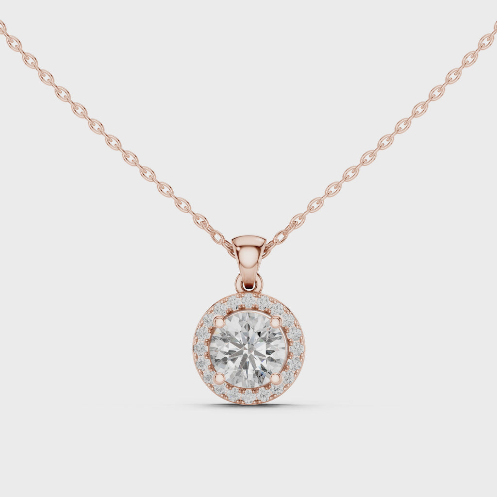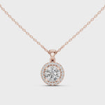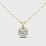 This Elegant Halo Lab-Grown Diamond Pendant blends timeless sophistication with modern craftsmanship. At the center sits a brilliant 6.50 mm round lab-grown diamond, elevated in a secure prong setting to showcase maximum fire and sparkle. Surrounding the centerpiece is a perfectly arranged halo of 20 micro-set round lab-grown diamonds, enhancing brilliance and creating a bold yet elegant look.