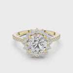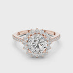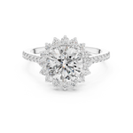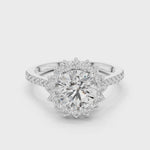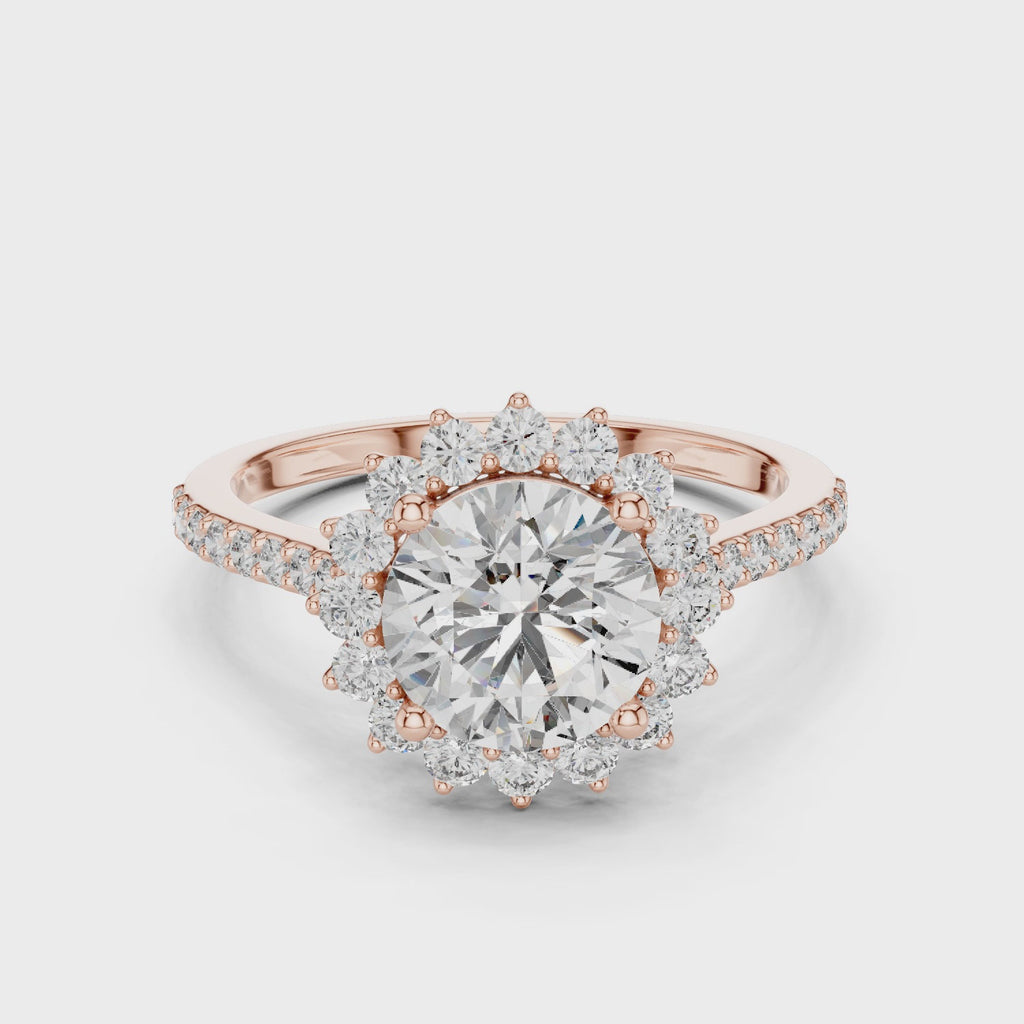The Elegant Sunburst Halo Diamond Ring is a breathtaking masterpiece inspired by celestial radiance. The center features a brilliant 7.40 mm round diamond, surrounded by a striking sunburst halo of meticulously arranged accent stones that enhance its brilliance from every angle.