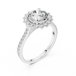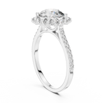 A double-layered halo composed of 1.30 mm and 1.70 mm diamonds adds depth, sparkle, and luxurious dimension. The shank is delicately adorned with a continuous line of diamonds, giving a refined, graceful finish while maintaining structural strength.