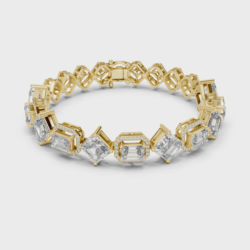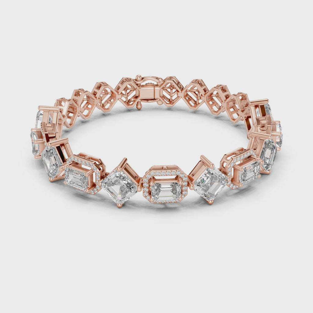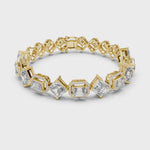 This Designer Radiant & Emerald Diamond Bracelet is a sophisticated fine-jewelry creation engineered with precision and luxury. The 6.5-inch bracelet features an elegant sequence of radiant-cut and emerald-cut diamonds, arranged to create a bold geometric aesthetic while maintaining a smooth, fluid wrist movement.
