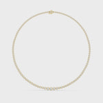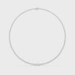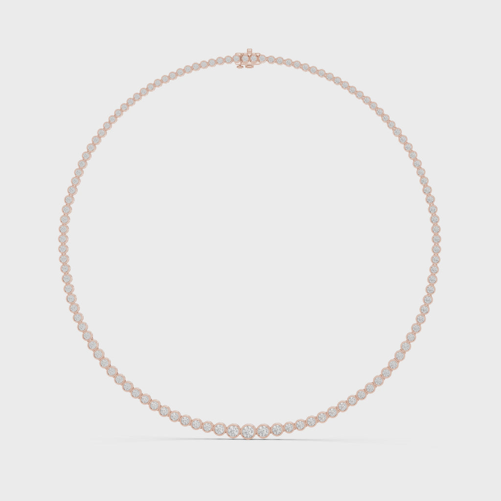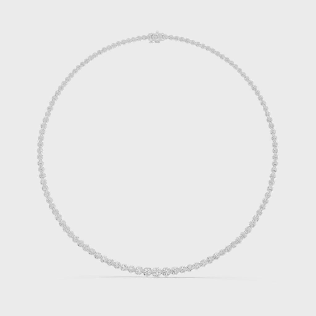 This Premium Round Lab-Grown Diamond Necklace blends timeless elegance with modern craftsmanship. Featuring a bold 6.05 mm bezel-set centerpiece, this necklace showcases a beautifully graduated arrangement of round lab-grown diamonds that form a graceful, continuous halo around the neckline.