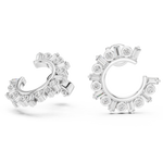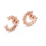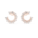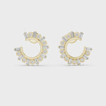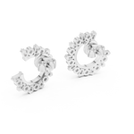 The outer arc is embellished with larger round diamonds for a bold highlight, while the inner arc features a continuous row of precision-set smaller stones, enhancing overall brilliance and visual depth. The balanced arrangement gives these earrings a radiant, floral-inspired charm, making them ideal for both special occasions and sophisticated daily wear.